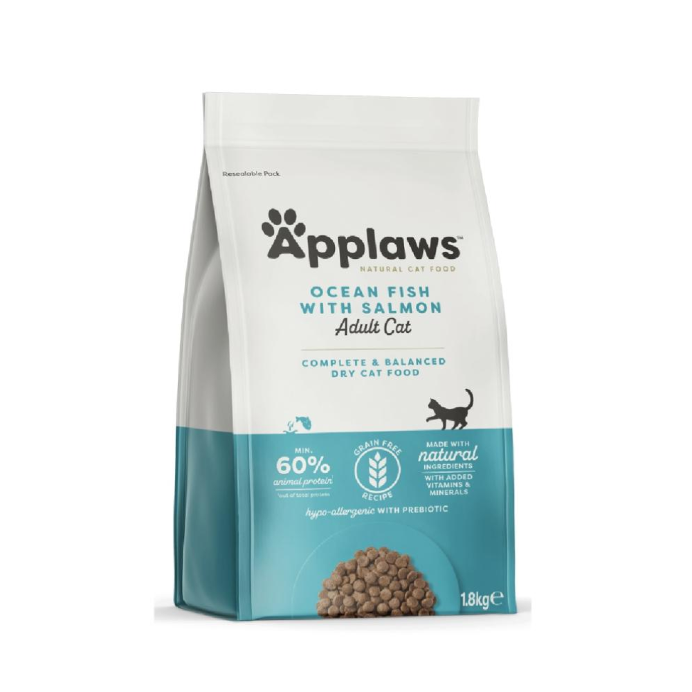 لا يحتوي طعام القطط البالغة الجاف الكامل من Applaws بنكهة سمك المحيط مع السلمون على أي شيء أكثر من المكونات المذكورة مع إضافة الفيتامينات والمعادن للقطط البالغة.