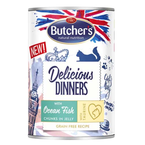 قطع سمك السلمون المرقط في هلام من Butcher's Delicious Dinners، طعام رطب للقطط 400 جرام