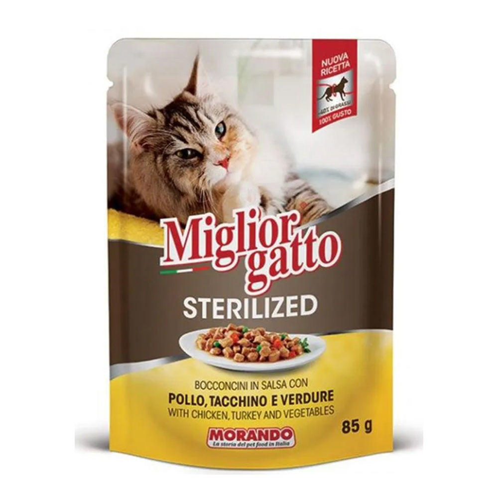 يعد طعام Migliorgatto للقطط المعقمة الحل الأمثل لتلبية احتياجاتها الغذائية والحفاظ على نشاطها في حالة جيدة، وذلك بفضل وصفة خاصة تحتوي على -25% دهون مقارنة بوصفات Morando Migliorgatto الأخرى.