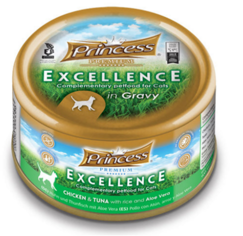 نقدم لك علب Princess Premium Excellence من الدجاج والتونة مع الأرز واليقطين في طعام مبلل للقطط، وهو تجسيد للمتعة المطبخية للقطط!