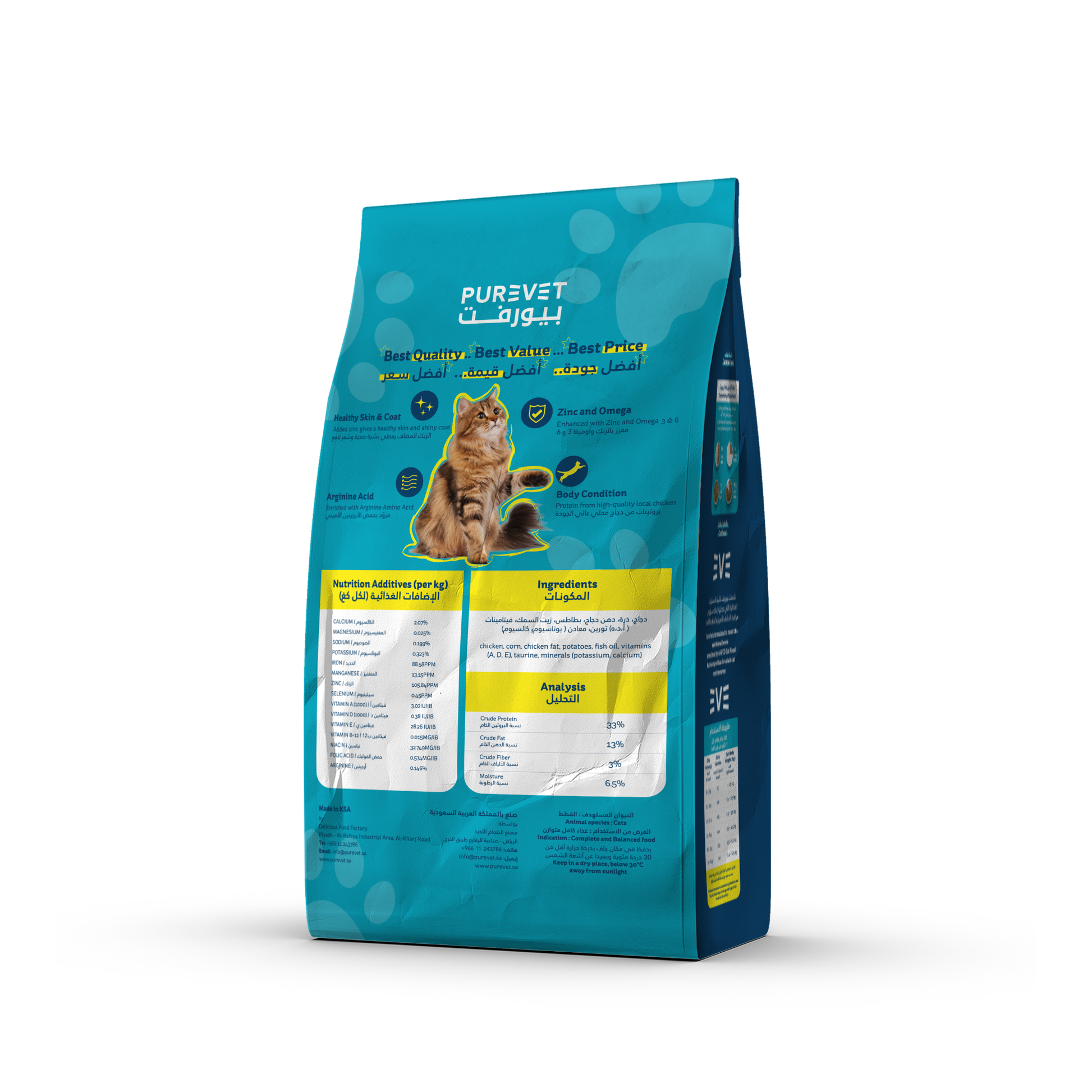 يحتوي على بروتينات عالية الجودة من الدجاج، والتي تعمل على تعزيز صحة العضلات وتوفير الطاقة المستدامة للنشاط اليومي لقطتك.