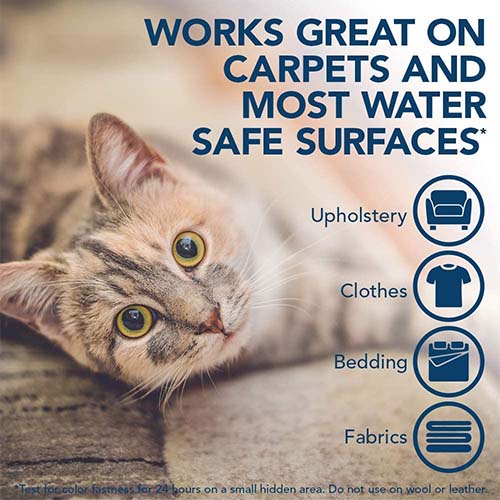 - قوي وآمن على الأسطح - يزيل بقع وروائح الكلاب والقطط من السجاد والمفروشات والفراش والألعاب القماشية والملابس وغيرها من الأسطح المقاومة للماء في منزلك. يمكنك حتى استخدامه كغسول قبل الغسيل
