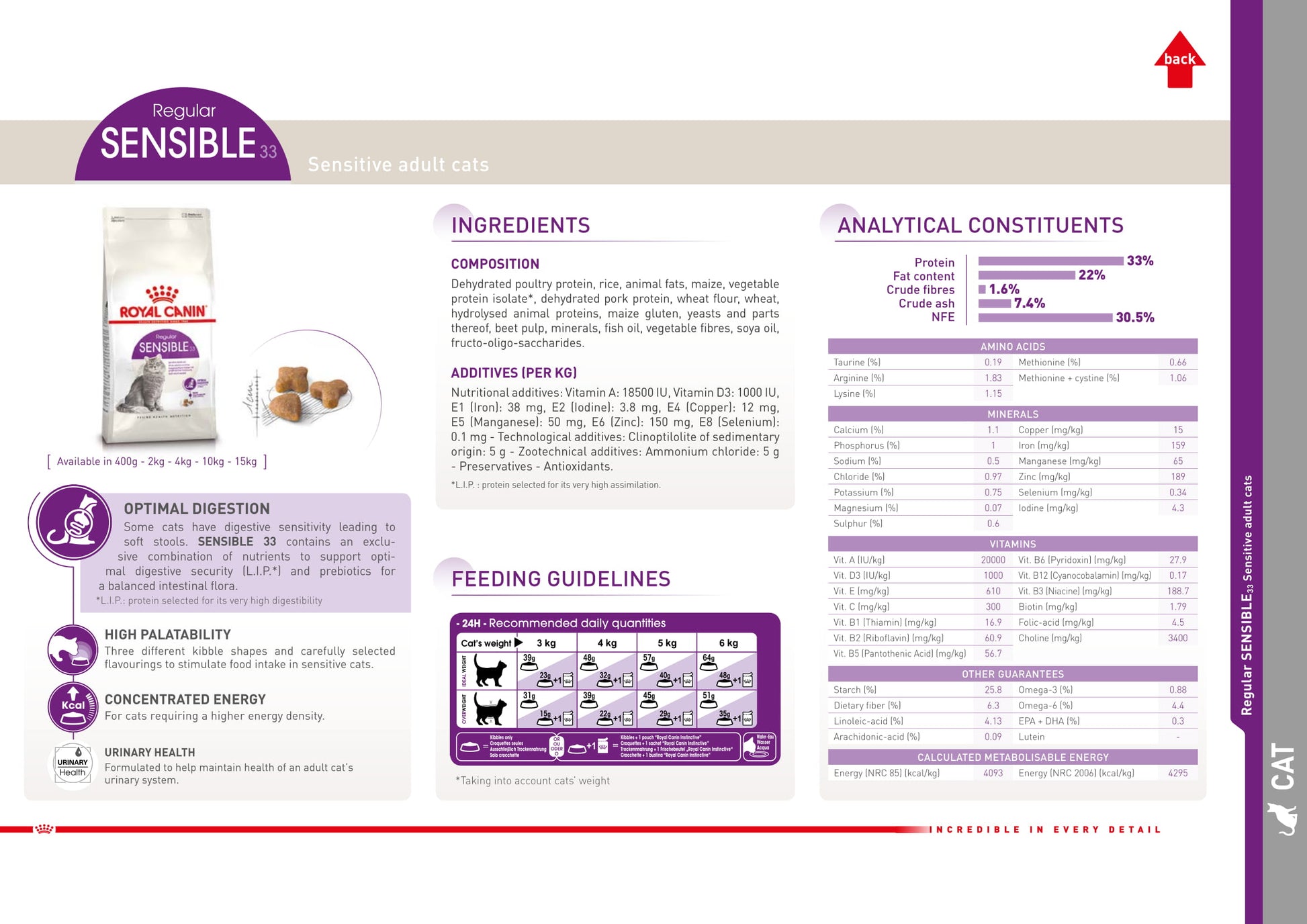 مخصص للقطط التي تعاني من حساسية في الجهاز الهضمي من عمر 1 إلى 7 سنوات. تم تركيب طعام "سينسيبل" بالألياف البريبايوتيكية التي تساعد في تغذية البكتيريا النافعة في القولون وتعزز صحة الجهاز الهضمي. هذا يقلل من رائحة البراز ويساهم في تحسين جودة البراز.