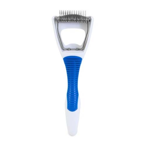 The JW® GripSoft® Cat Deshedding Tool removes large amounts of loose fur and debris to reduce overall shedding and promote healthy skin and coat. The soft rubber handle has a non-slip grip making it a comfortable and easy-to-use grooming tool, time, and time again. The Stainless steel blades have a hook feature that captures hairballs seamlessly and provides years of continuous use. These specially made blades create a clean, polished look. A durable handle is long-lasting for years to come. Ships in two assorted colors: blue or yellow.