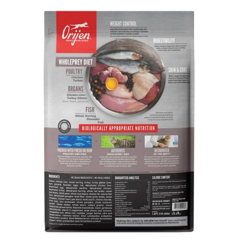 Help your cat thrive with the power of protein-rich recipes that provide peak nourishment. As obligate carnivores, modern cats are built like their ancestors and thrive on a Biologically Appropriate diet rich in protein and fat sourced from a variety of animal ingredients. ORIJEN™ Fit & Trim™ diet is optimized to support lean muscle mass and is specifically designed to support peak physical conditioning with quality animal ingredients from fresh or raw free-run1 chicken, wild-caught herring, free-run1 turkey and wild-caught flounder. With rich inclusions of WholePrey animal ingredients like organs and bone, ORIJEN food is made with the most nutrient-dense, succulent parts of the prey to deliver the nutrition cats need. With 85%2 animal ingredients and a freeze-dried liver coating, this diet is beyond comparison.