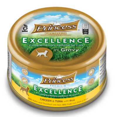 Introducing Princess Premium Excellence cans of Chicken & Tuna with Rice in Gravy Wet Food for Cats, the epitome of feline culinary delight!